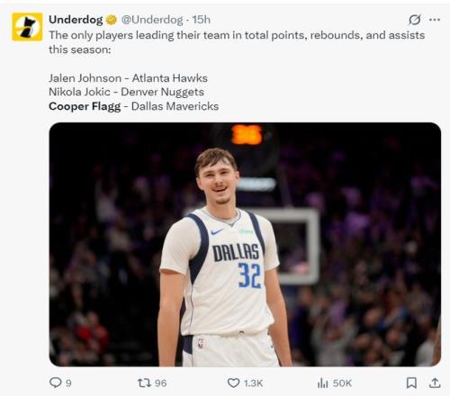6.目前联盟只有三人得分、篮板、助攻都是球队最多:约基奇、杰伦-约翰逊、弗拉格;