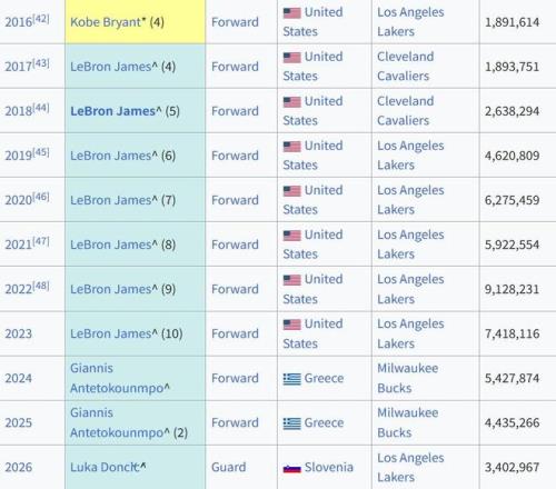 值得一提的是,在此前10年的全明星票选中,东契奇的队友詹姆斯7次夺得票王,此外字母哥2次夺魁,科比则在退役赛季夺得票王。