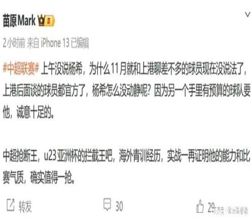 近日,知名体育媒体人苗原发文表示,有一支手里有预算的中超球队正在全力追逐杨希,而且态度相当明确,不是试探,而是要直接签下这位20岁的希望之星。另外,苗原还提到,杨希其实在去年11月就和上海海港聊得差不多了,当时大家普遍认为这笔交易只剩下了时间问题。